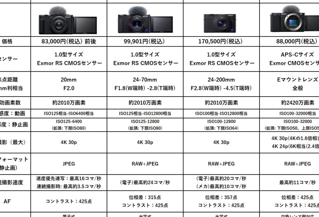 以下は、異なる価格帯でおすすめのvlogカメラ ソニーです。それぞれの技術仕様や特長を考慮し、自分に最適なモデルを見つける参考にしてください。