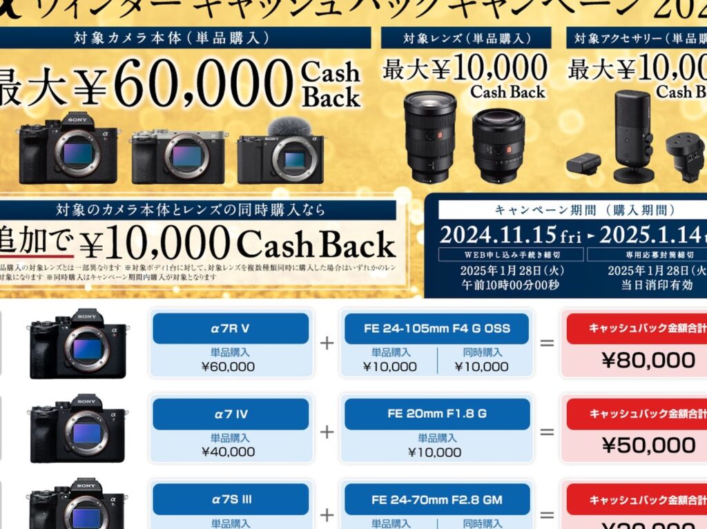 キャッシュバックキャンペーンは、ソニーのカメラを購入する際に非常に魅力的な特典です。このキャンペーンを利用することで、購入価格から一定額が返金されるため、実質的な負担を軽減することができます。私たちがテストした各モデルは、このようなキャンペーンの恩恵を受けやすく、多くのユーザーにとって価値ある選択肢となるでしょう。