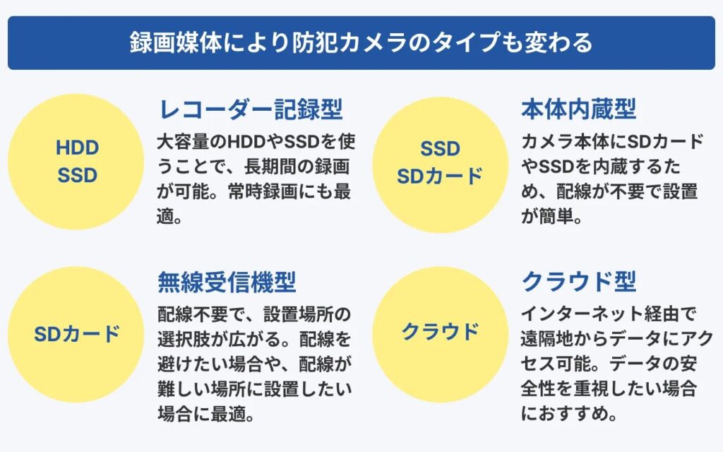 - 連続録画: 常時映像を記録し続ける方式で、長時間の監視が必要な場所に適しています。